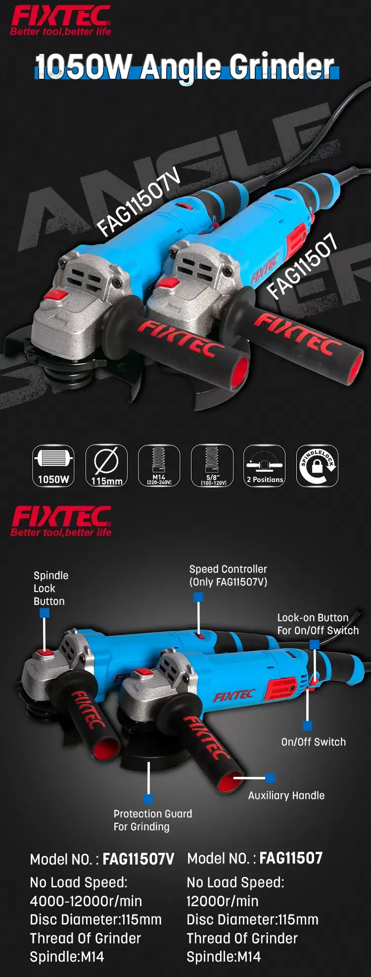 -Control de velocidad: En comparación con la amoladora angular (FAG11507), esta de 115 mm (4,5 pulgadas) pequeña amoladora angular eléctrica (FAG11507V) se puede ajustar en dos velocidades. Baja velocidad 4000r/min, alta velocidad 12000r/min para pulir y esmerilar.