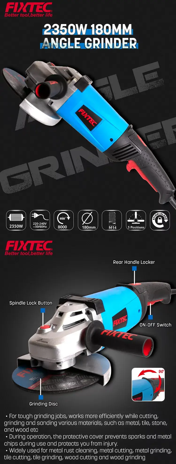-Manija trasera giratoria: Este amoladora angular grande Está equipado con una manija trasera giratoria que proporciona mayor control y flexibilidad durante la operación. La función giratoria permite ajustar el mango hasta 90 grados, asegurando un agarre cómodo y una maniobrabilidad óptima.