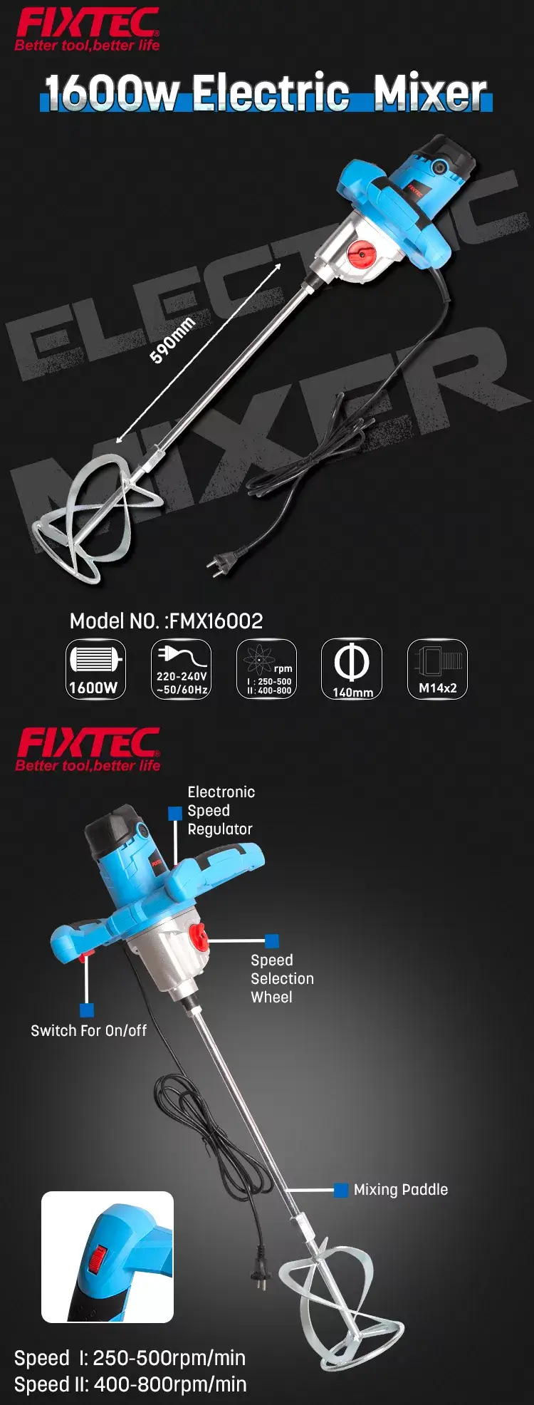 -Paleta mezcladora larga: Nuestra batidora eléctrica FIXTEC está equipada con una paleta mezcladora larga de hasta 590 mm, lo suficientemente larga como para mezclar cualquier material de manera fácil y suave. Esta máquina mezcladora de concreto también viene con un cable largo para trabajos en interiores a larga distancia.